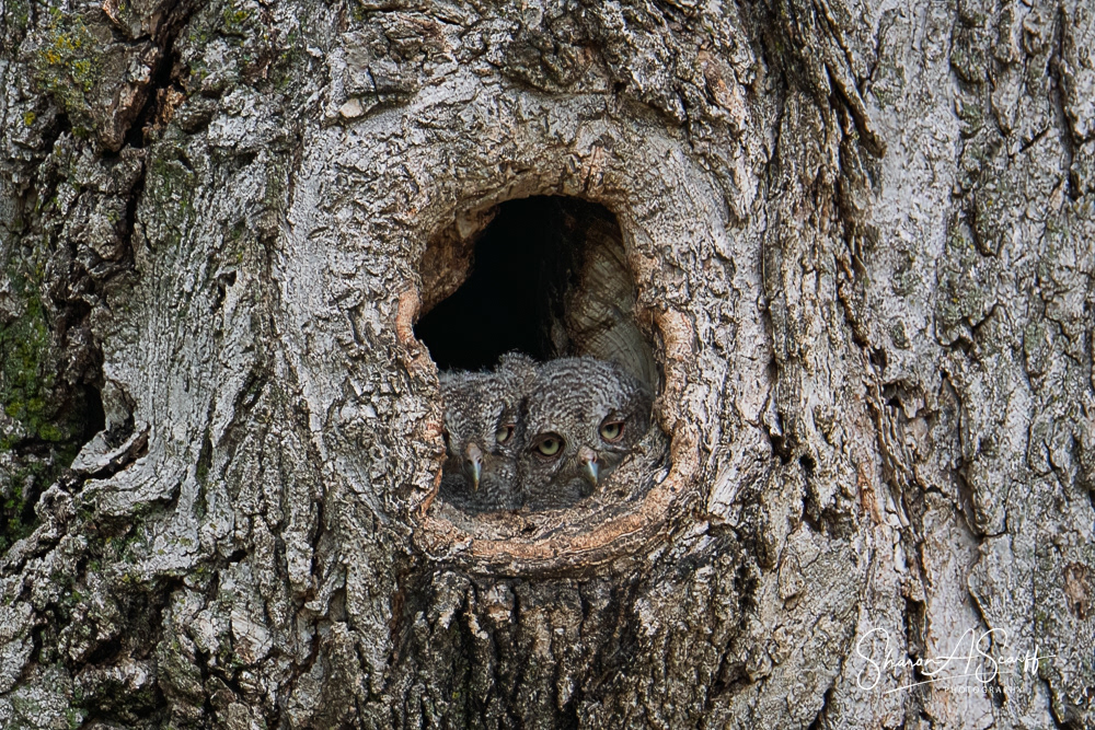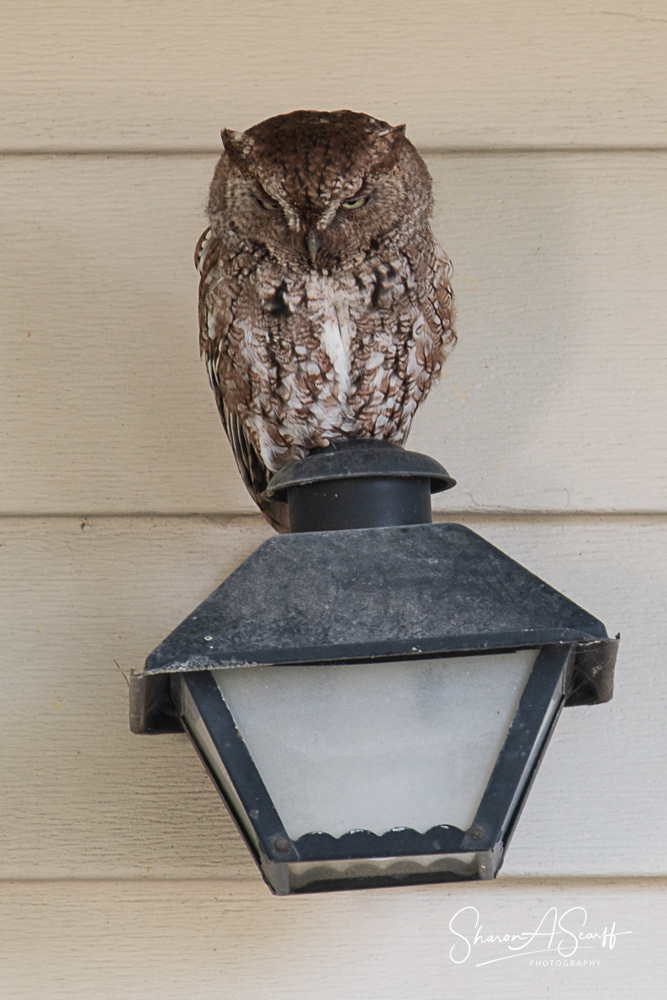 What a fantastic six weeks I had watching the Eastern Screech Owls. Screech--what I named the main owl--was a hoot! (Pun intended!) He would sit on my light outside my front door or in the tree straight out from that door--looking at the door. I assume he wanted me to come out and visit with him which I did.